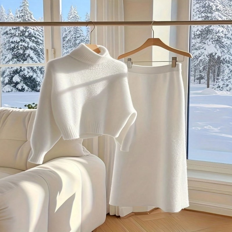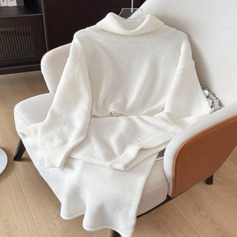 Conjunto de suéter tejido informal y falda larga para mujer, suéter de cuello alto y combo de falda larga, color liso, otoño/invierno
