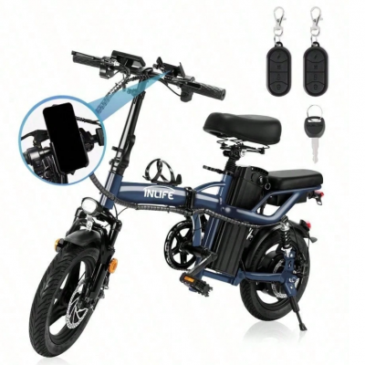 Bicicleta eléctrica plegable para adultos de 14 pulgadas: motor sin escobillas de alta velocidad de 400 W, batería extraíble de 48 V y 10 Ah, capacidad de carga de 45 kg, doble suspensión, doble asiento, 3 velocidades, neumáticos todoterreno, perfecta par